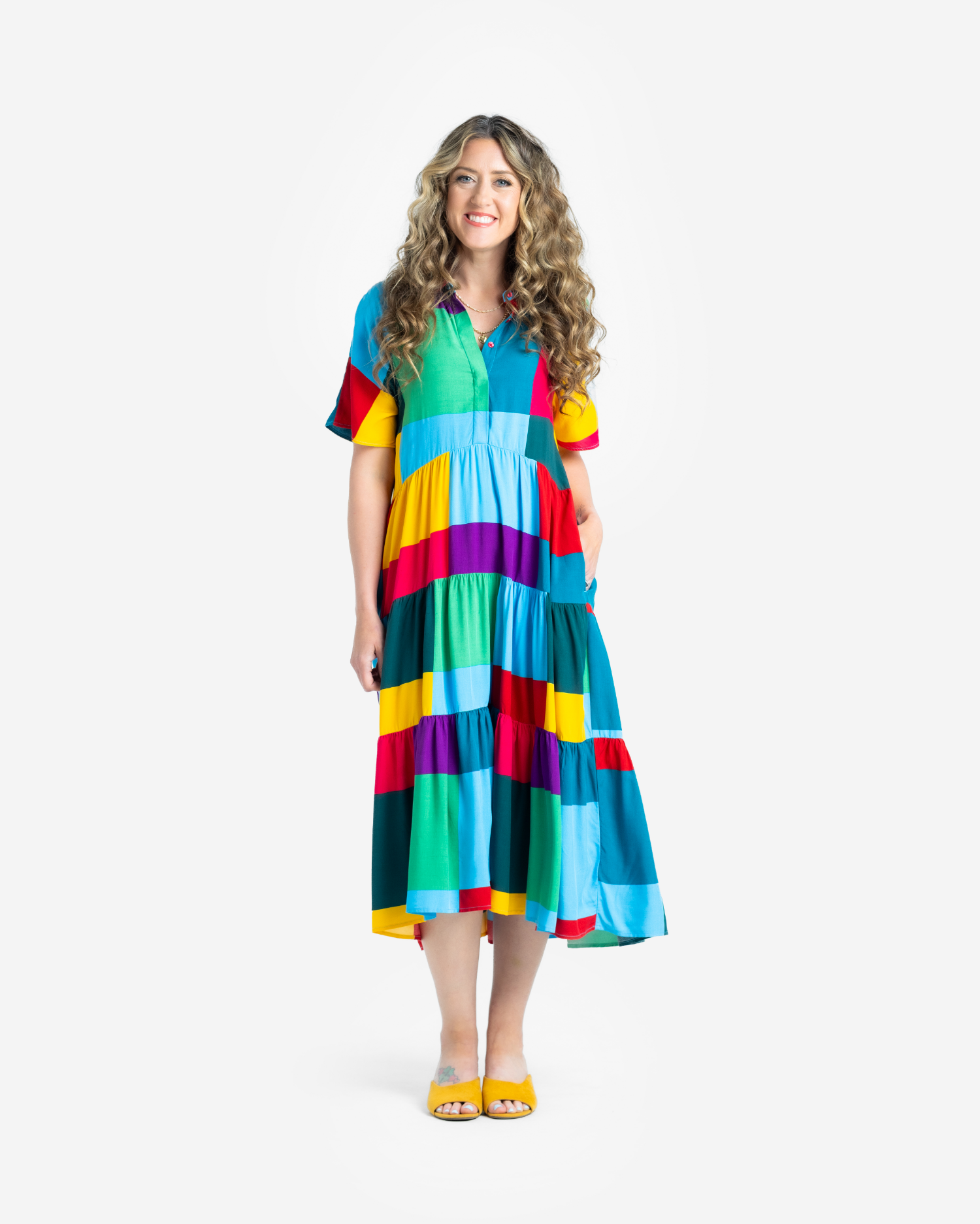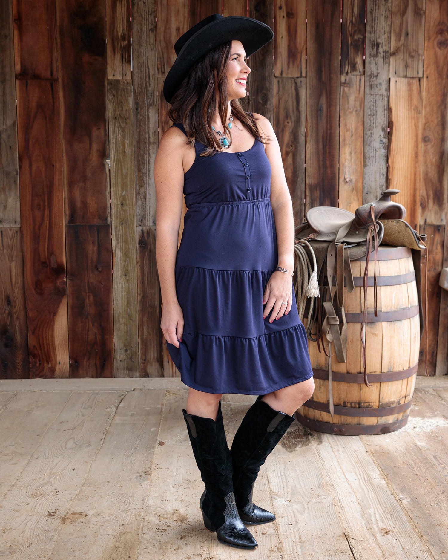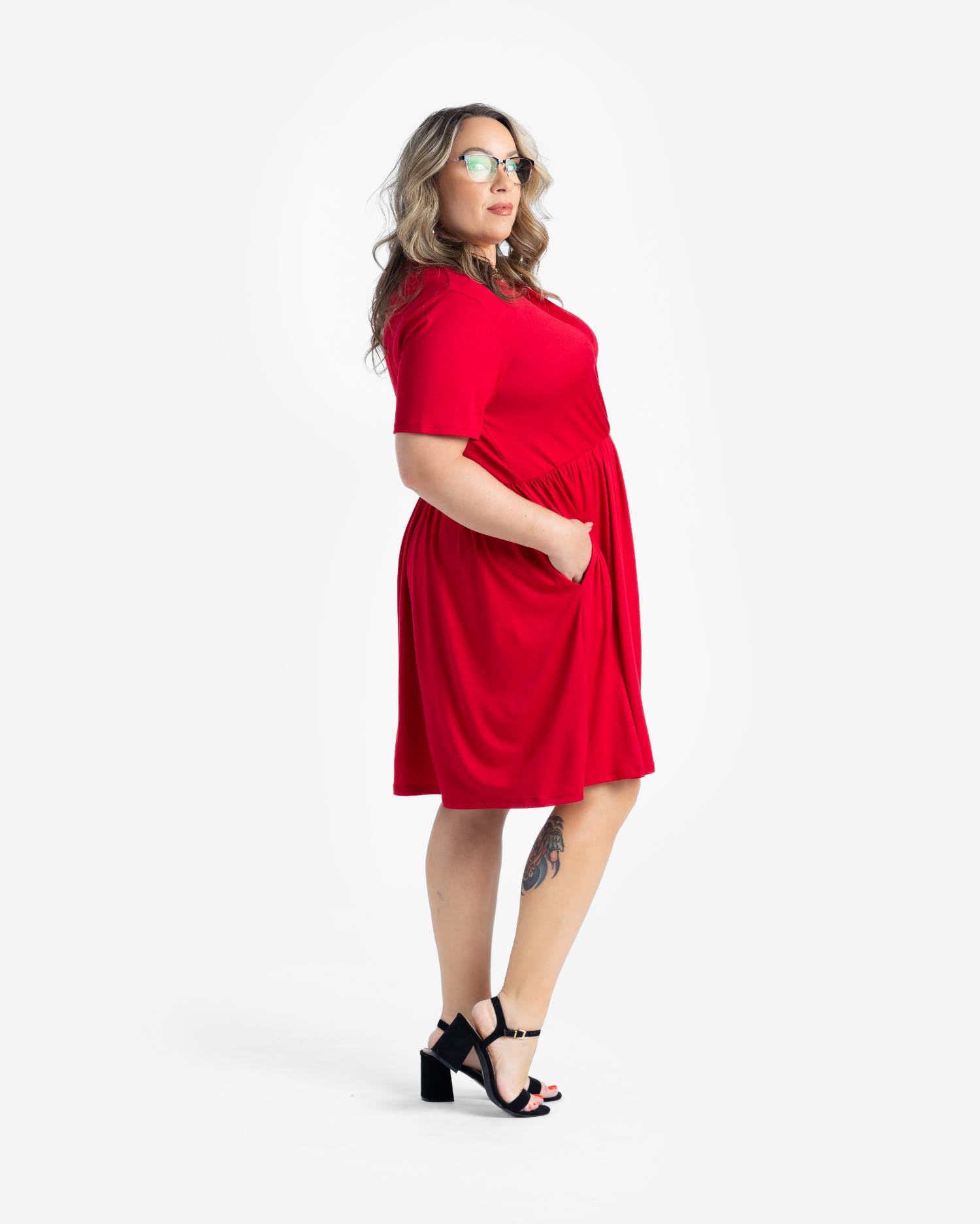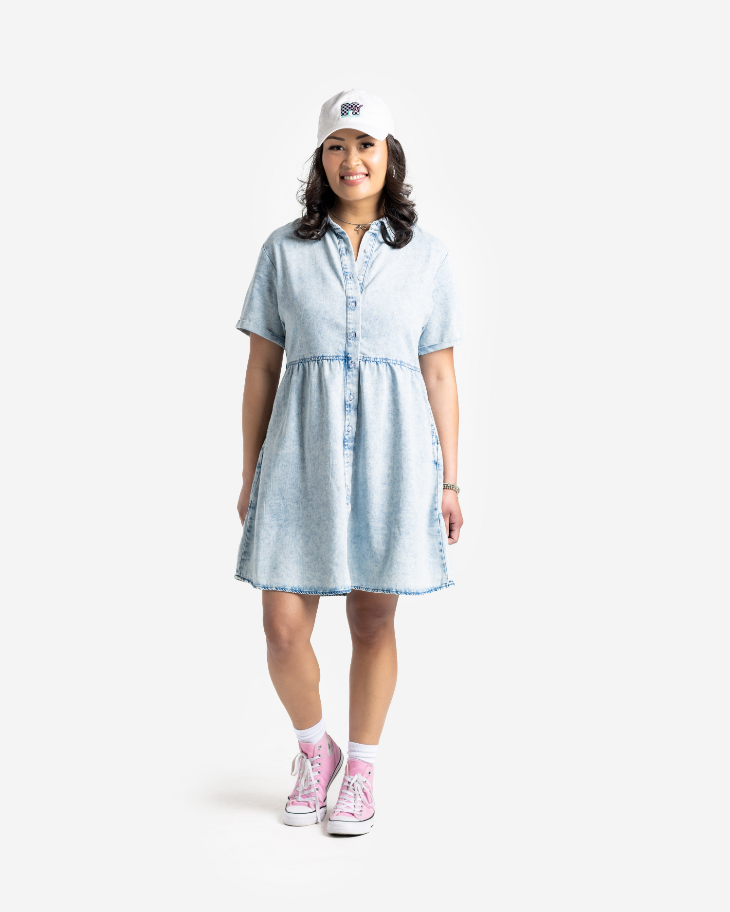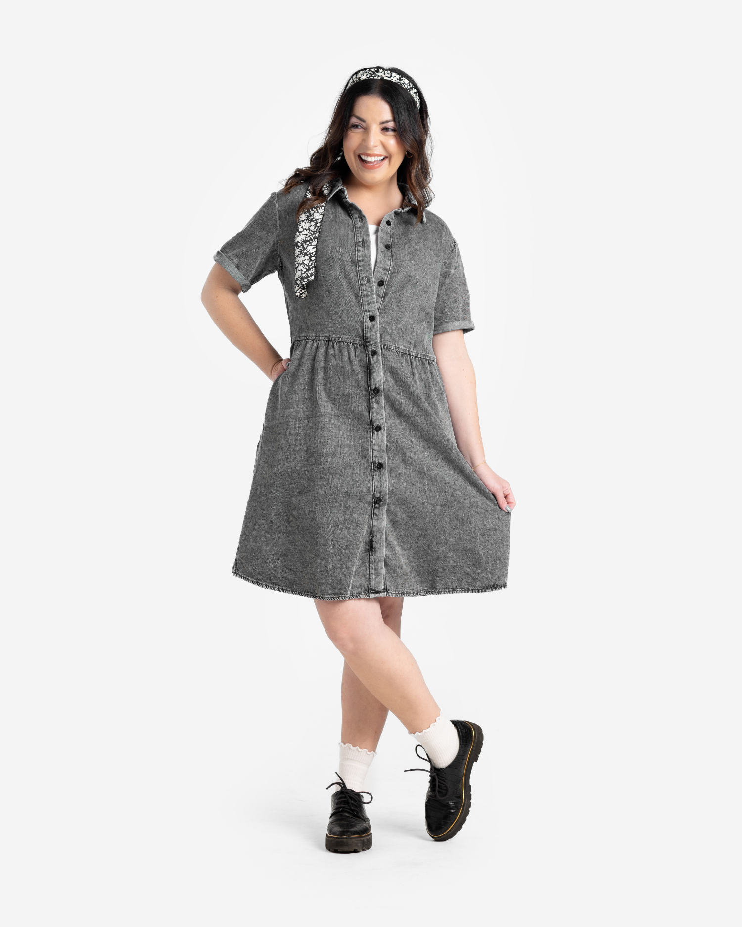 The Ashton Denim Dress is effortlessly cool and endlessly stylish. With a collared neckline, functional buttons to the waist, and a flattering waist seam, it’s both timeless and comfy. Side seam pockets keep things practical, while faux buttons to the hem add a classic touch. Rolled-cuff short sleeves and tiered shirring at the back bring extra flair. Designed for a relaxed knee-length fit, it’s perfect for dressing up or down—just add sneakers or boots!