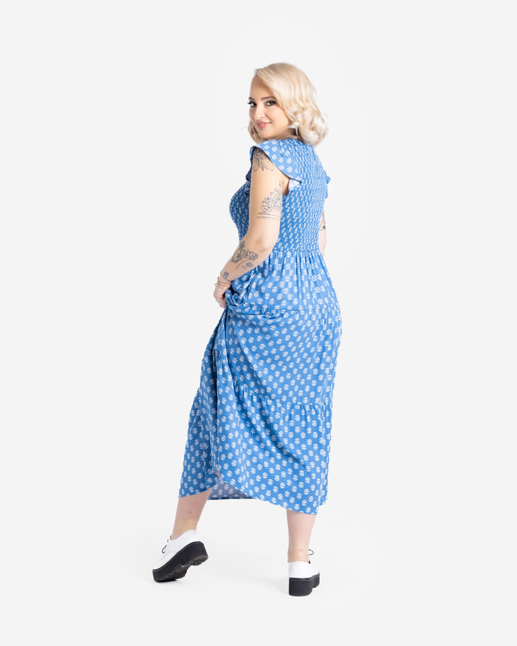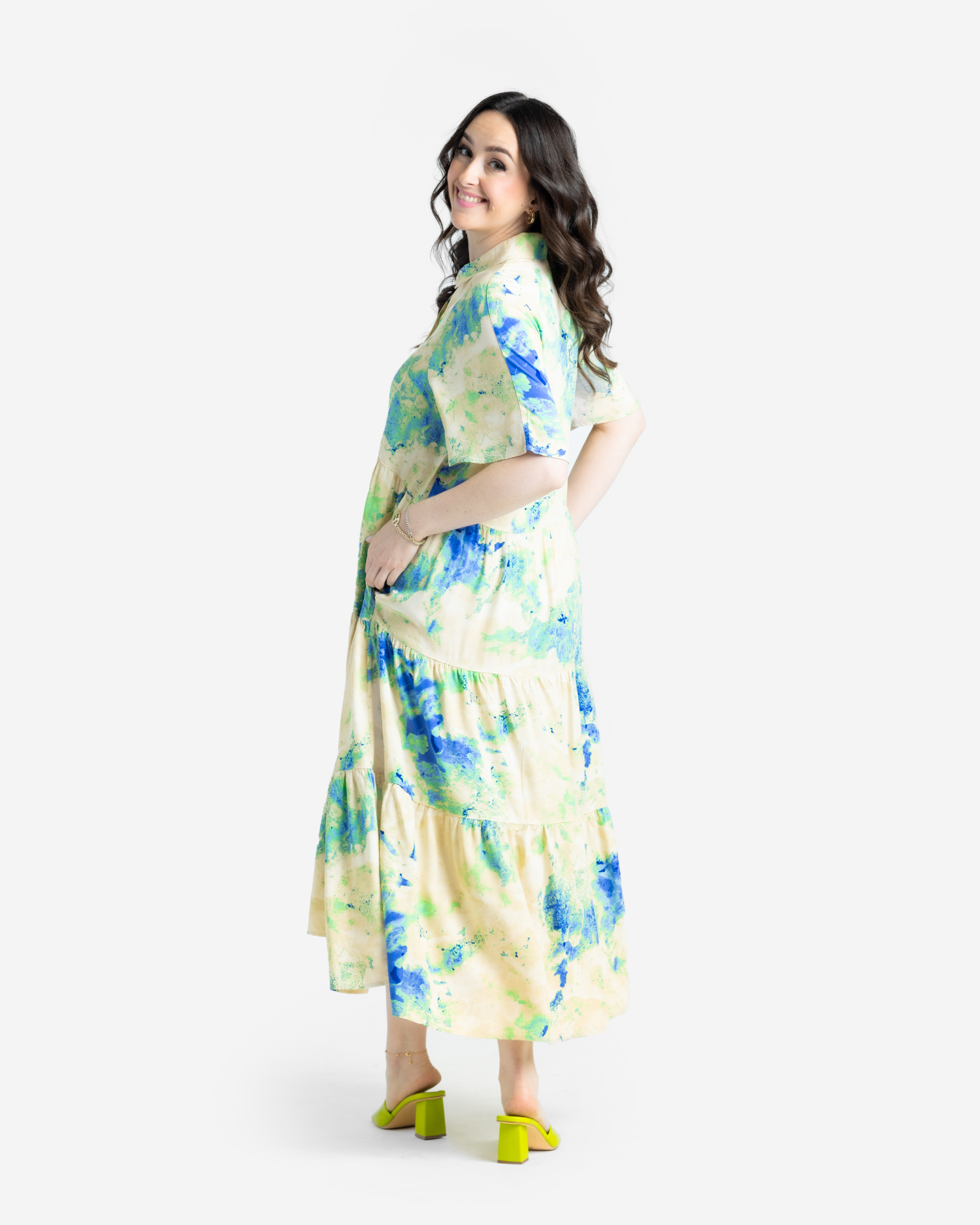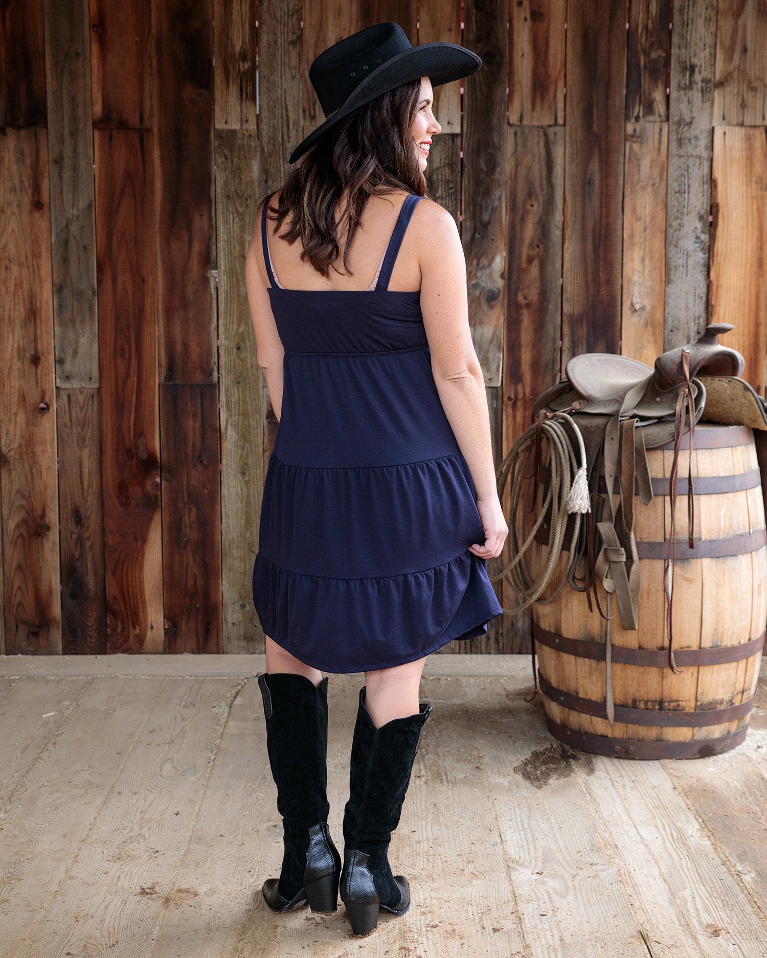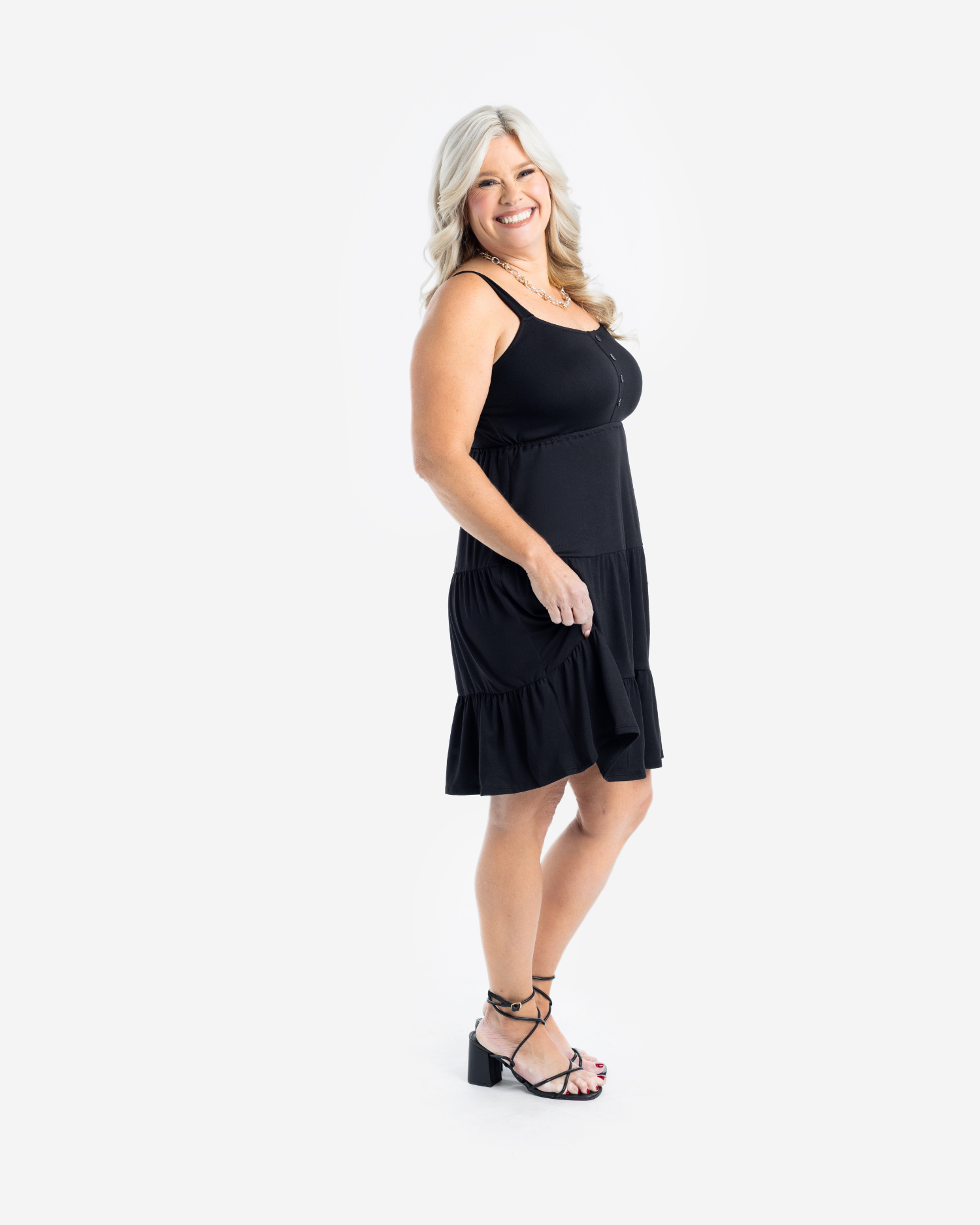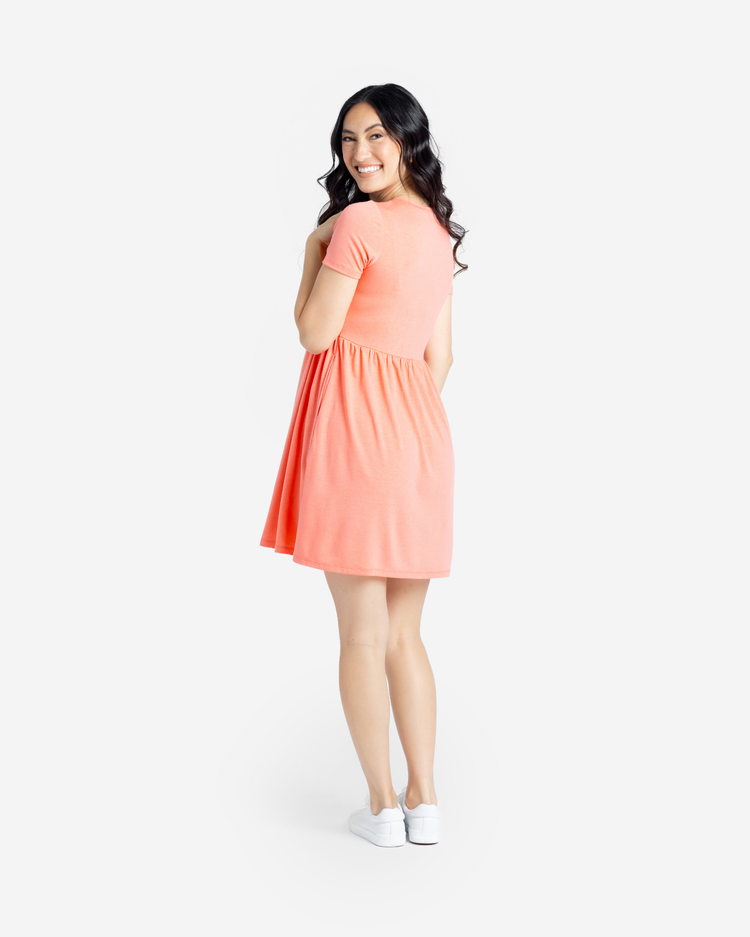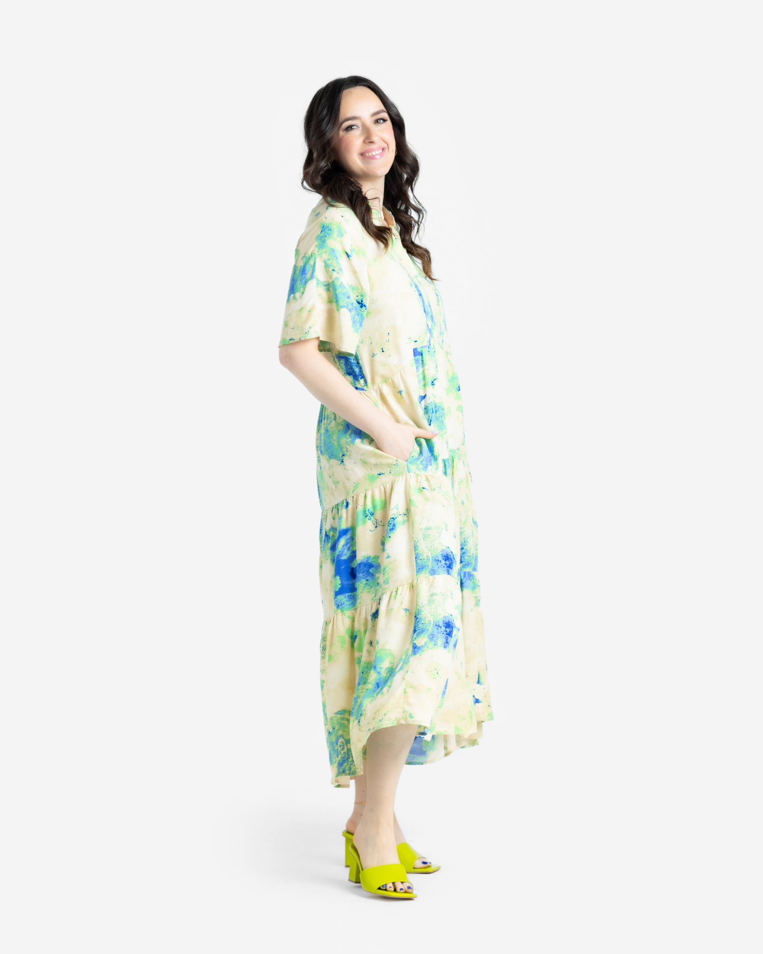 The Ashton Denim Dress is effortlessly cool and endlessly stylish. With a collared neckline, functional buttons to the waist, and a flattering waist seam, it’s both timeless and comfy. Side seam pockets keep things practical, while faux buttons to the hem add a classic touch. Rolled-cuff short sleeves and tiered shirring at the back bring extra flair. Designed for a relaxed knee-length fit, it’s perfect for dressing up or down—just add sneakers or boots!