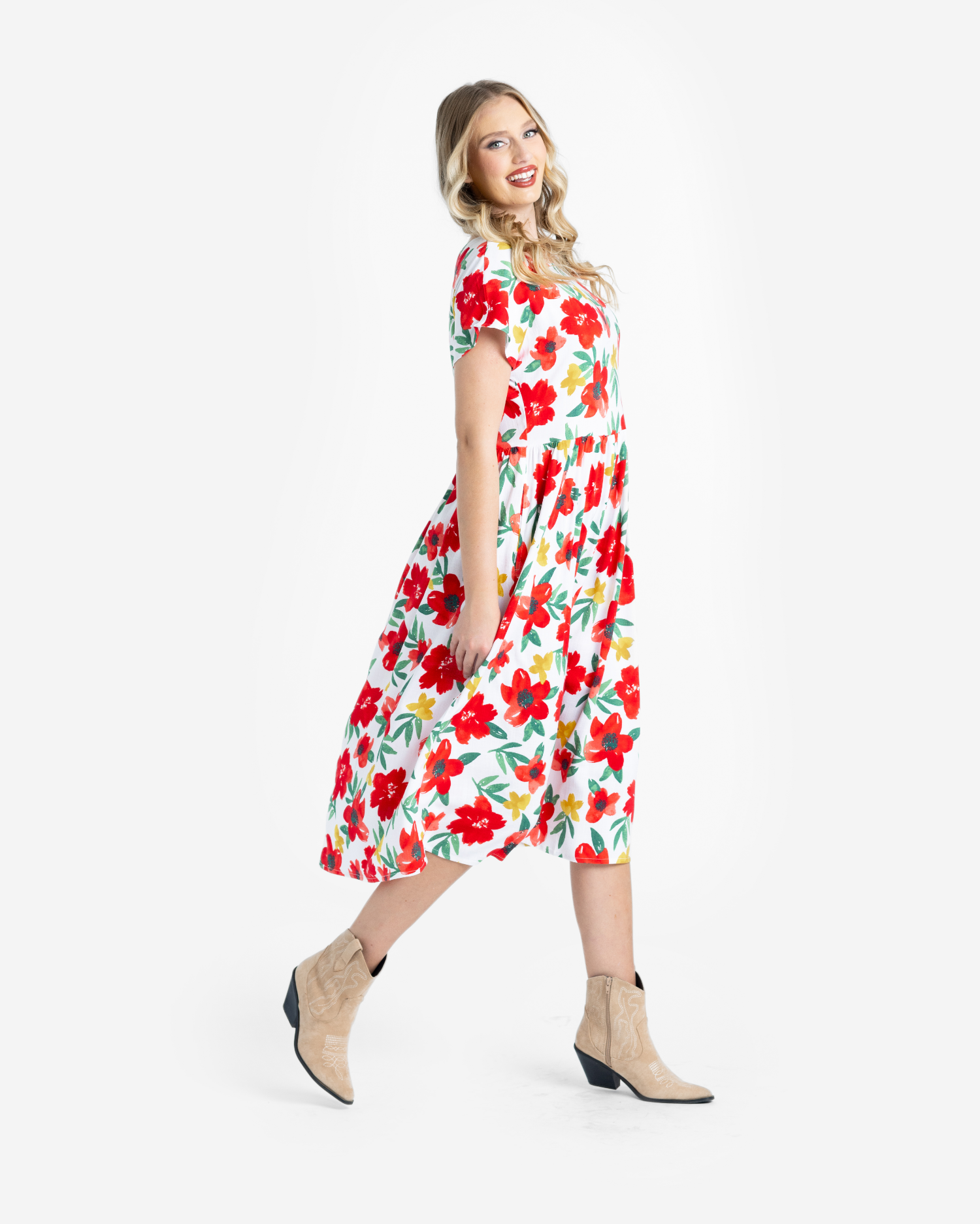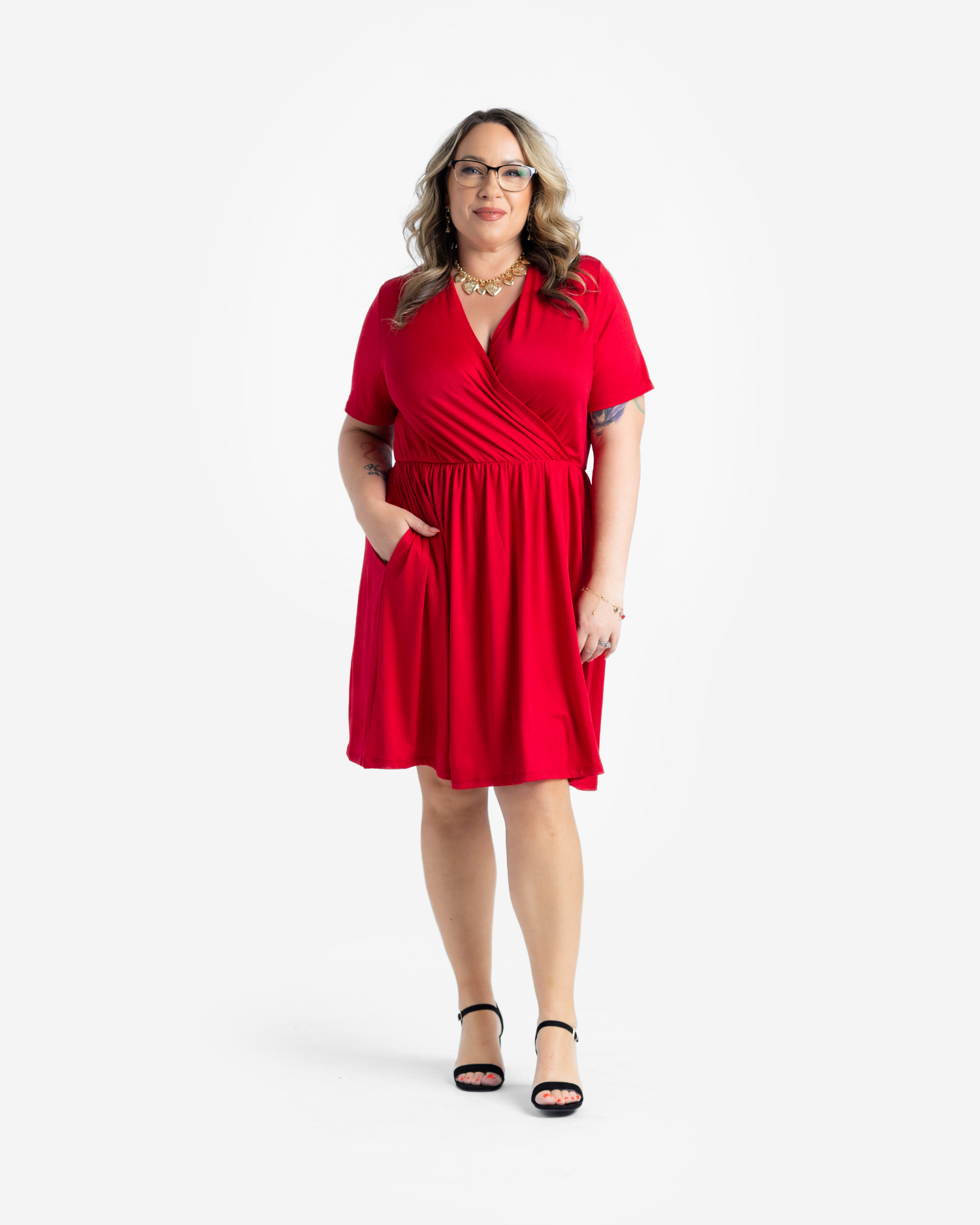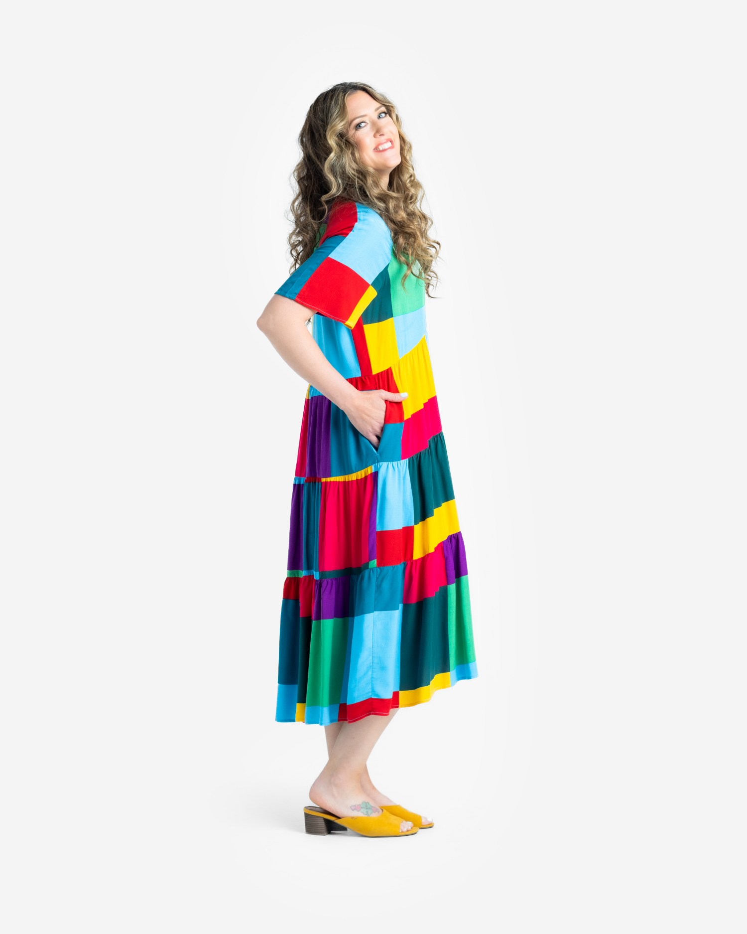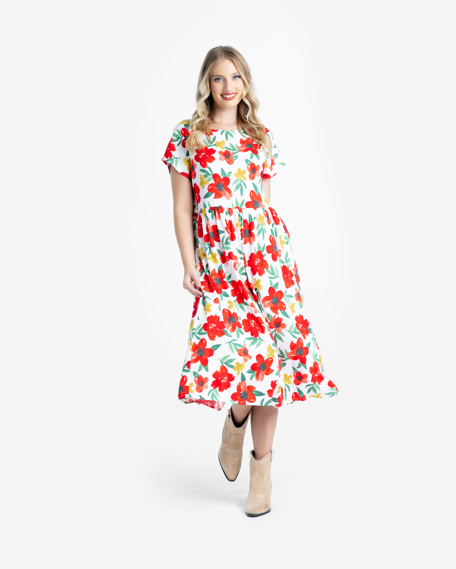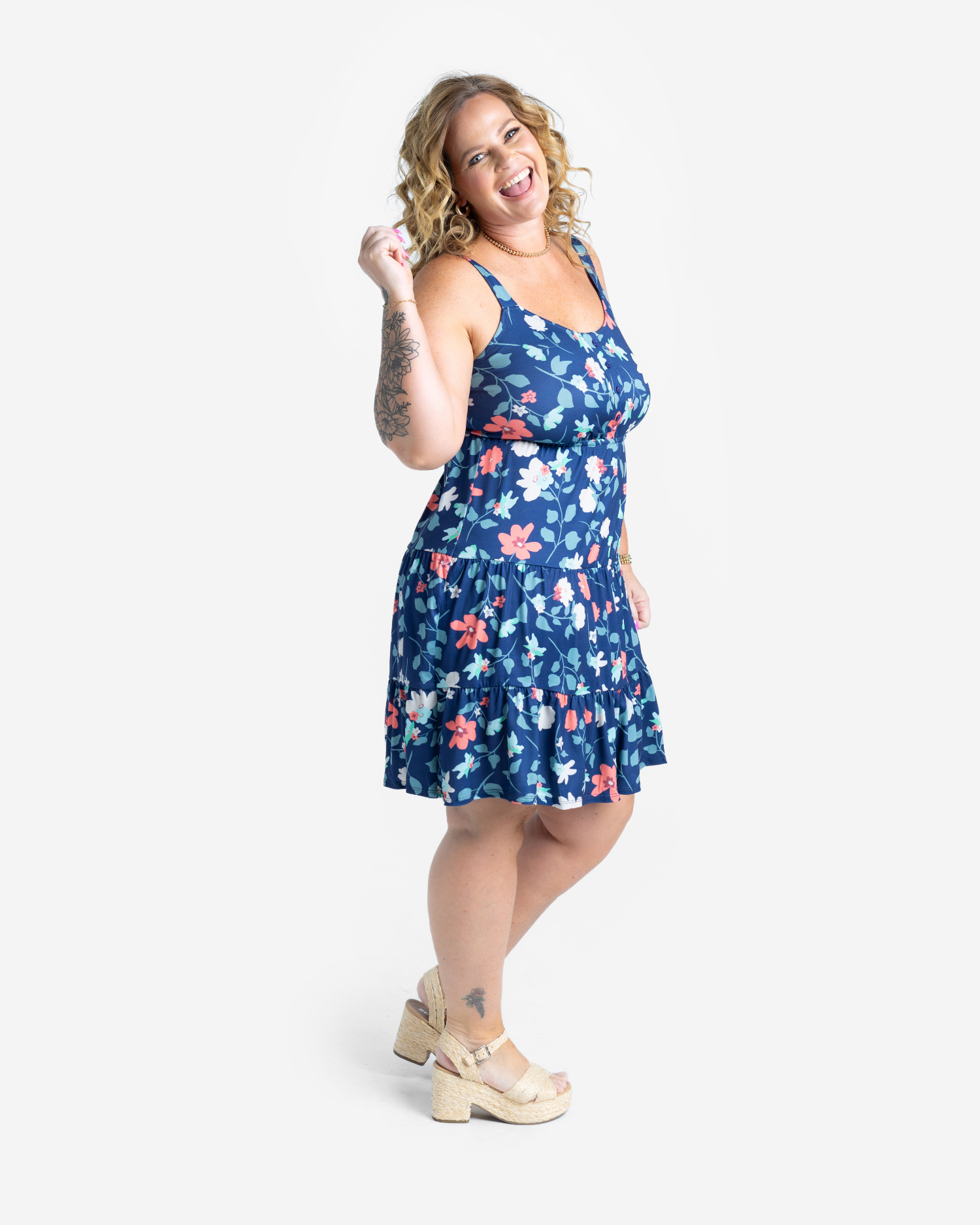 The Ashton Denim Dress is effortlessly cool and endlessly stylish. With a collared neckline, functional buttons to the waist, and a flattering waist seam, it’s both timeless and comfy. Side seam pockets keep things practical, while faux buttons to the hem add a classic touch. Rolled-cuff short sleeves and tiered shirring at the back bring extra flair. Designed for a relaxed knee-length fit, it’s perfect for dressing up or down—just add sneakers or boots!