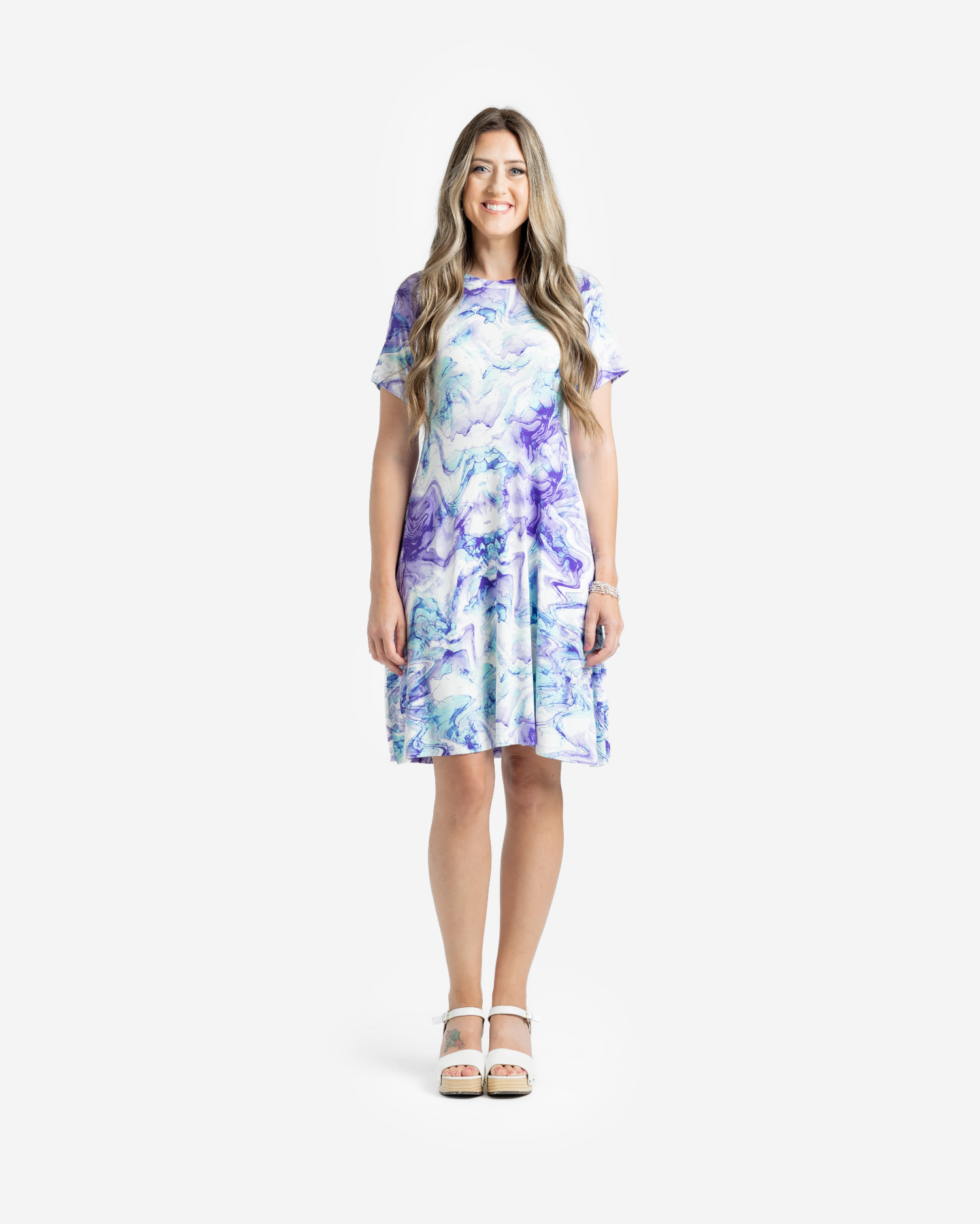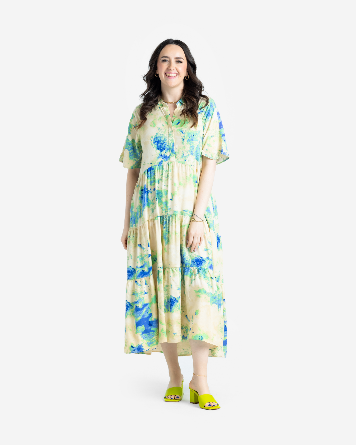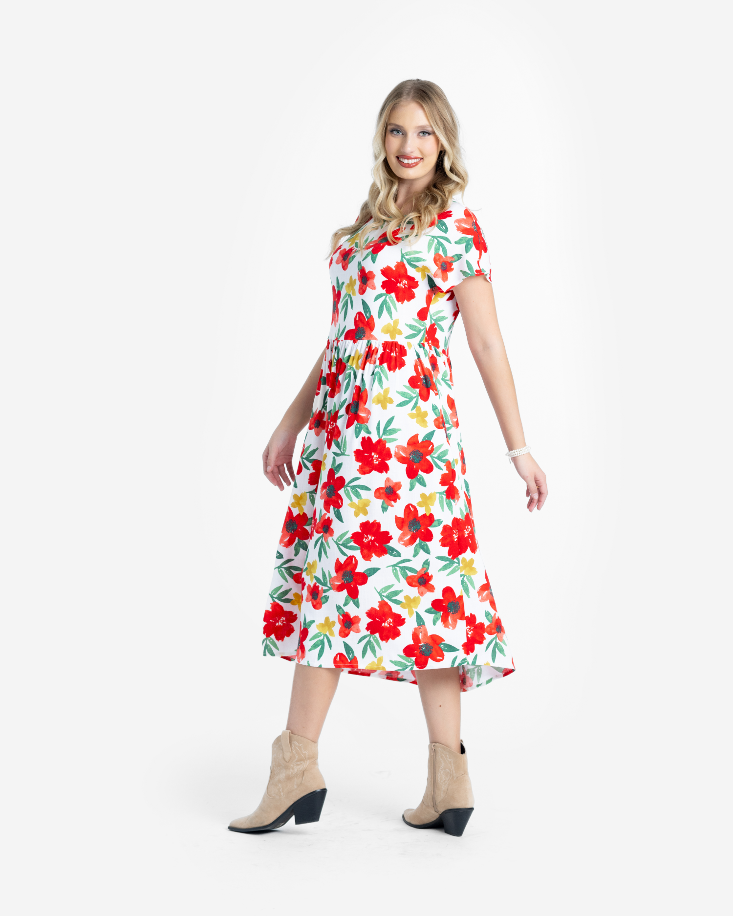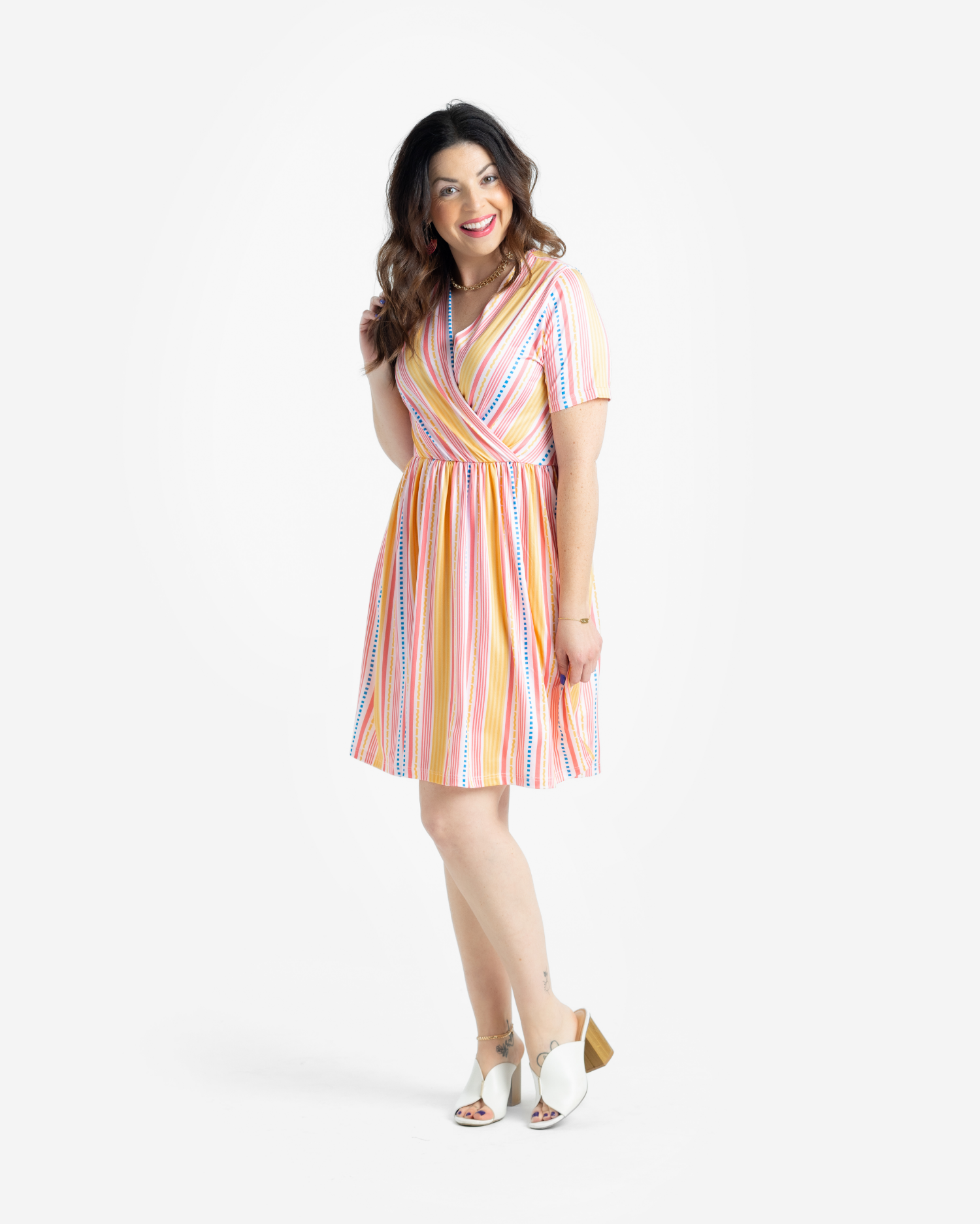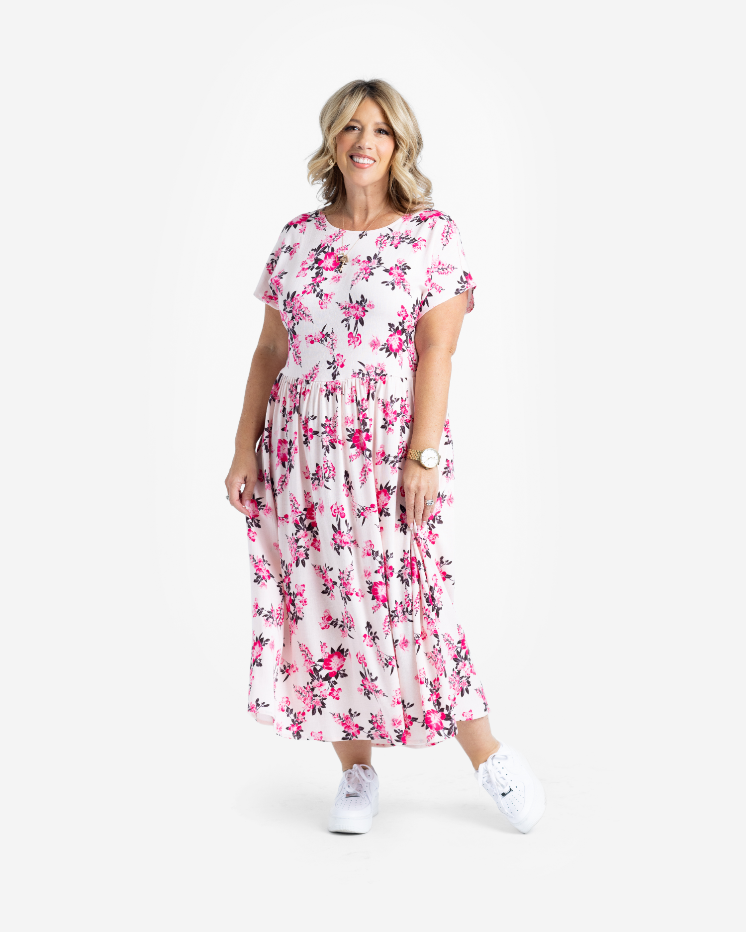 The Ashton Denim Dress is effortlessly cool and endlessly stylish. With a collared neckline, functional buttons to the waist, and a flattering waist seam, it’s both timeless and comfy. Side seam pockets keep things practical, while faux buttons to the hem add a classic touch. Rolled-cuff short sleeves and tiered shirring at the back bring extra flair. Designed for a relaxed knee-length fit, it’s perfect for dressing up or down—just add sneakers or boots!