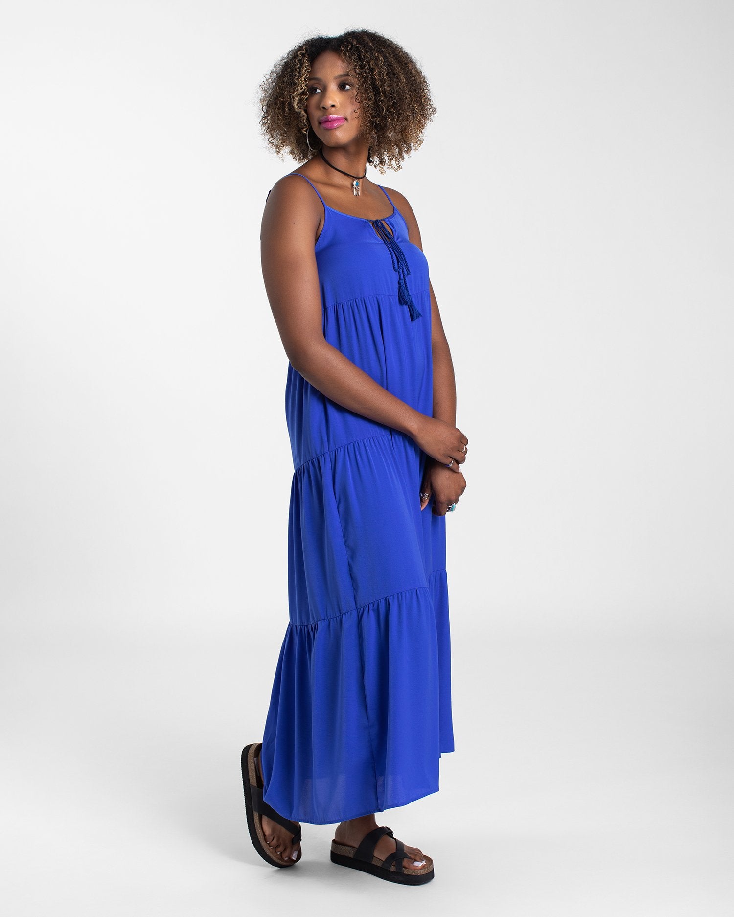Get ready to make a statement this summer with our Carina Tiered Maxi Dress! This lightweight and airy design is made from buttery soft microfiber polyester and features adjustable thin straps, a keyhole tassel tie, and three sheered tiers. Whether you’re spending the day at the beach or dancing the night away, this dress will keep you looking your best.