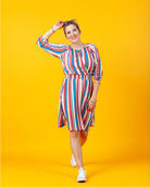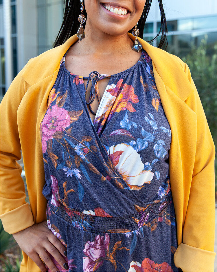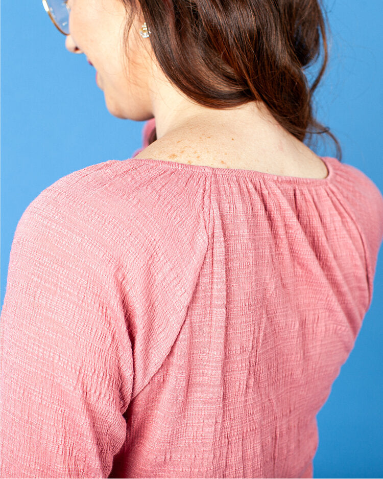 The Details: The Jody long sleeve peasant dress has shirring around the entire neckline, faux wrap detail on her bodice, a drawcord at the neckline, as well as an elastic chain stitch smocking waistband. She has sewn encased elastic around the entire neckline and the sleeve openings. Jody has Raglan sleeves, is a true-to-size fit, with three fabrics: 2x2 Rib 87/13 Poly/Span, TR Jersey 49/45/6 Rayon/Poly/Span, Crinkle Jersey 66/33/1 Poly/Rayon/Span.