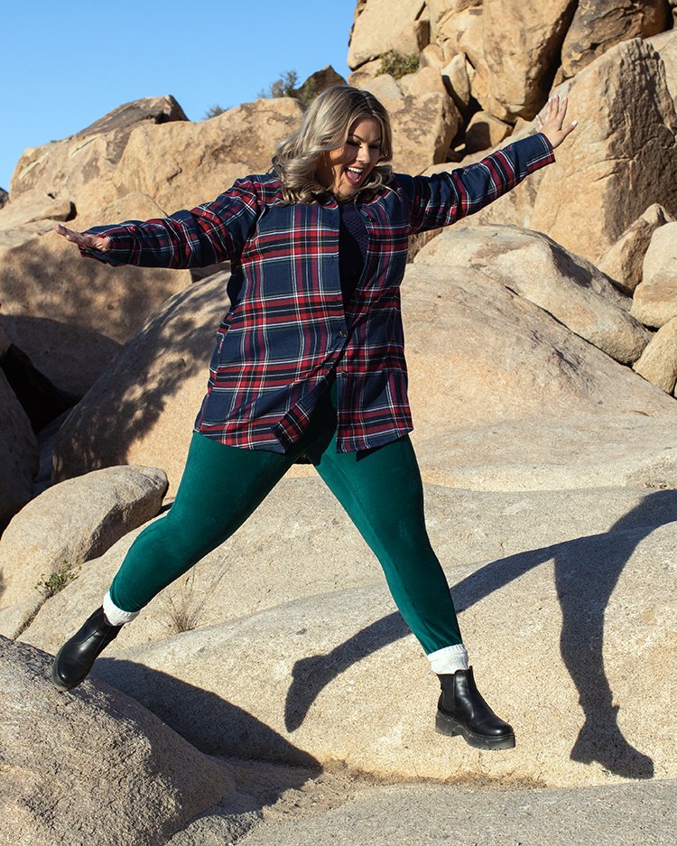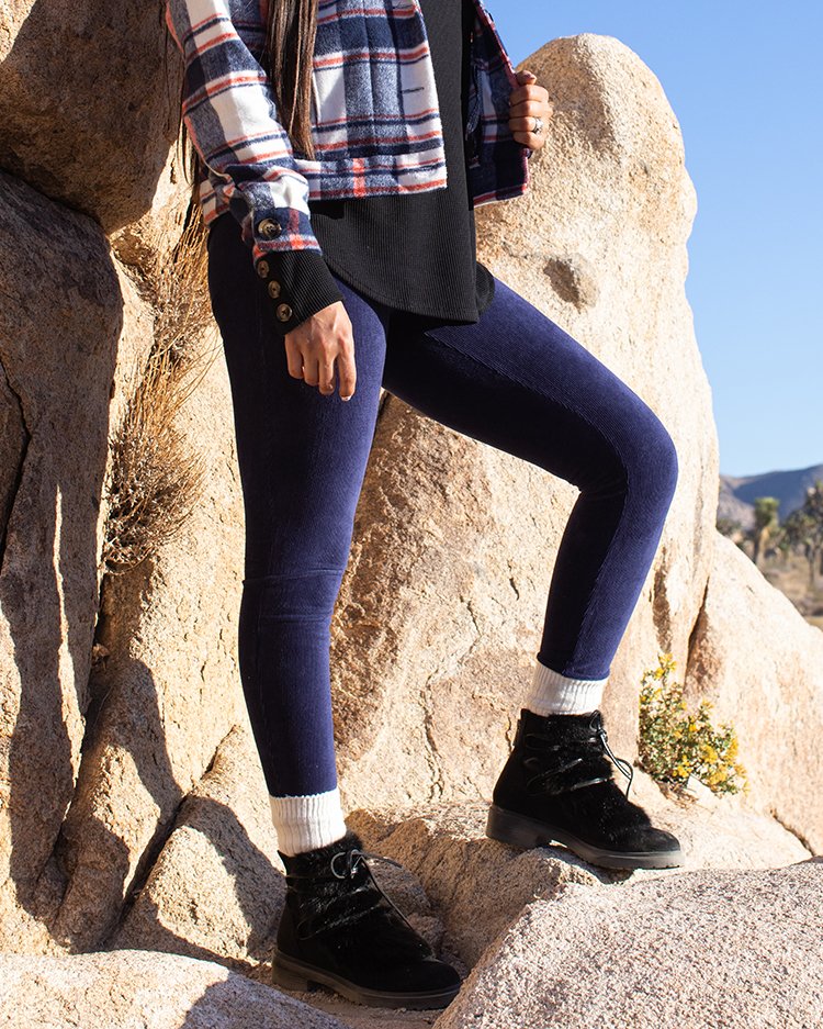 The Corduroy Pant has a skinny fit, made of Stretch Corduroy and vertical wales. It features a 1 3/4” non-roll elastic waistband - not your average leggings waistband.