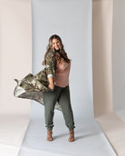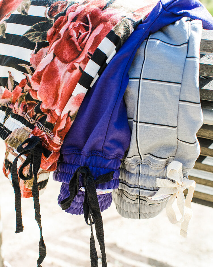 The Jax is a jogger style pant with a drawstring waist, cuffed ankle, and a relaxed fit. The Jax is made of French Terry cloth.