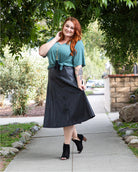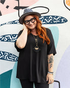 The Details: The Boyfriend T has a back and shoulder yoke with a wide elbow length sleeve and a slight A-line shape through the body. Her length hits near the high hip. She comes in Rayon Slub 95/5 Rayon/Span 200GSM & Rayon Jersey 95/5 Rayon/Span 200GSM. She has a relaxed fit.