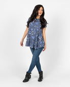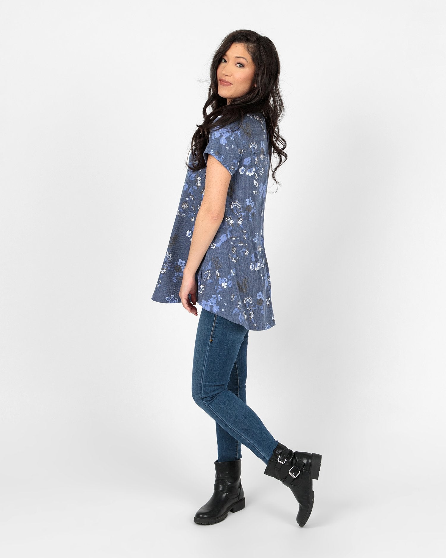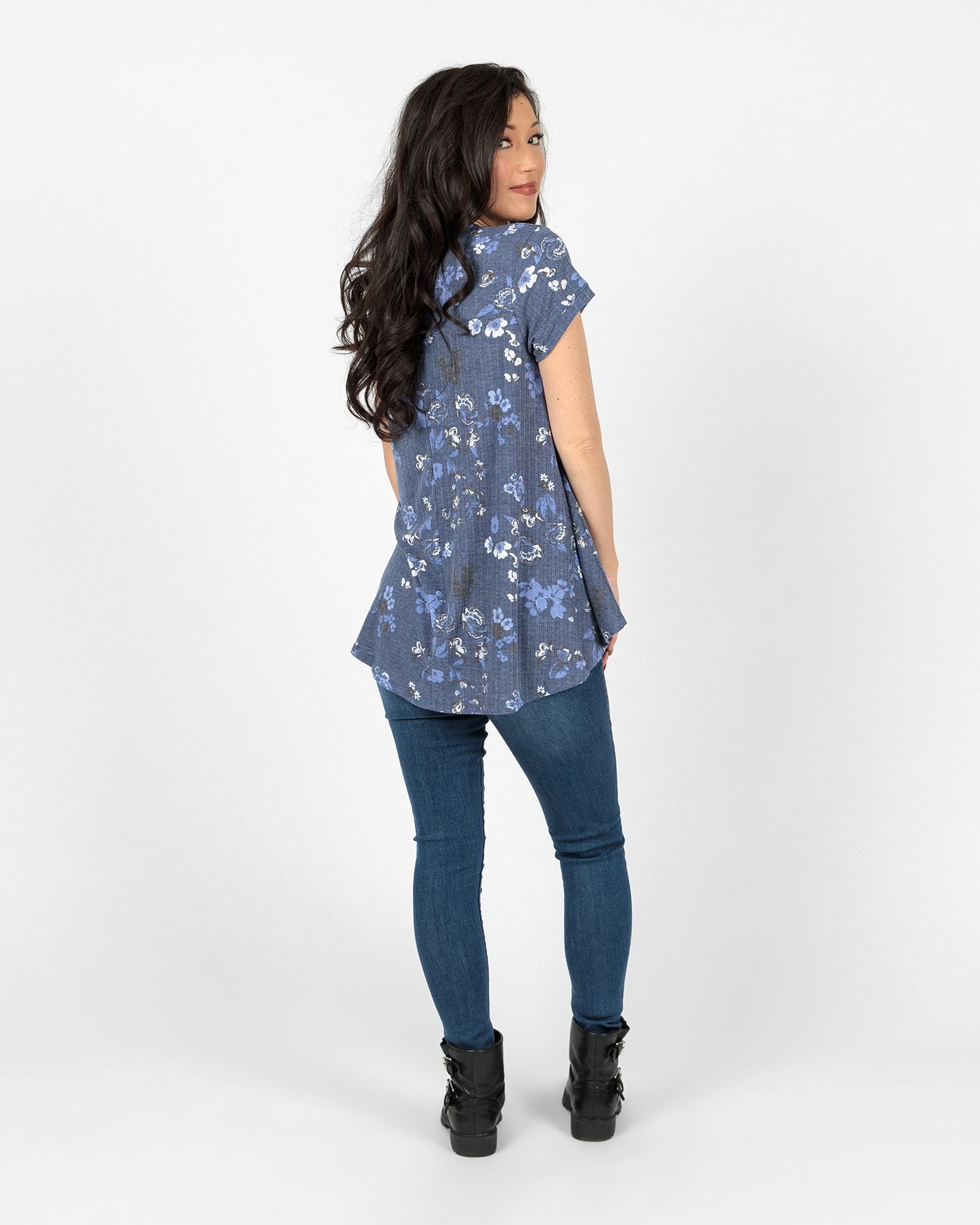 The Details: The Erika is a short-sleeved swing top with a back yoke, a band at the neck and sleeve opening, a center back seam, an A-line silhouette, and a curved hemline, with a relaxed fit.