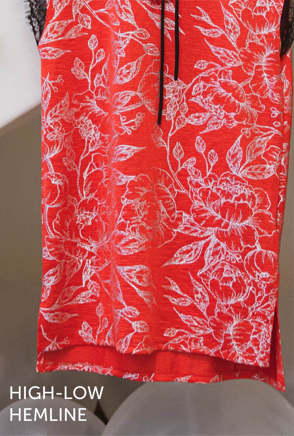 This sleeveless top features lace sleeve details, font tie keyhole neckline, high-low hemline and side slits.