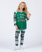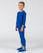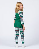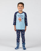 This super-soft knit PJ top & bottom set will keep your kiddos comfy, warm & cozy this winter. The raglan tee features a v-neck and 3/4 length sleeves. Full-length pull-on leggings with an elasticized waist & contrast wide cuff make for a snug fit. Unisex prints & sizing make these PJs perfect for girls and boys alike in fun matching print sets.