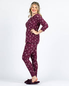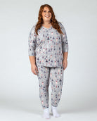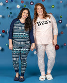 Cuddle up in this super soft knit PJ top & bottom set and stay comfy at bedtime or while lounging. This flattering v-neck raglan tee has 3/4 length sleeves and a slightly rounded hemline. Full-length pull-on leggings with a drawstring waist & contrast wide cuffs make for the perfect fit. Coordinating prints and graphics make this the perfect PJ set to enjoy the holiday season.