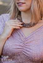 This cinched v-neck top features a center front ruching and tulip sleeves.