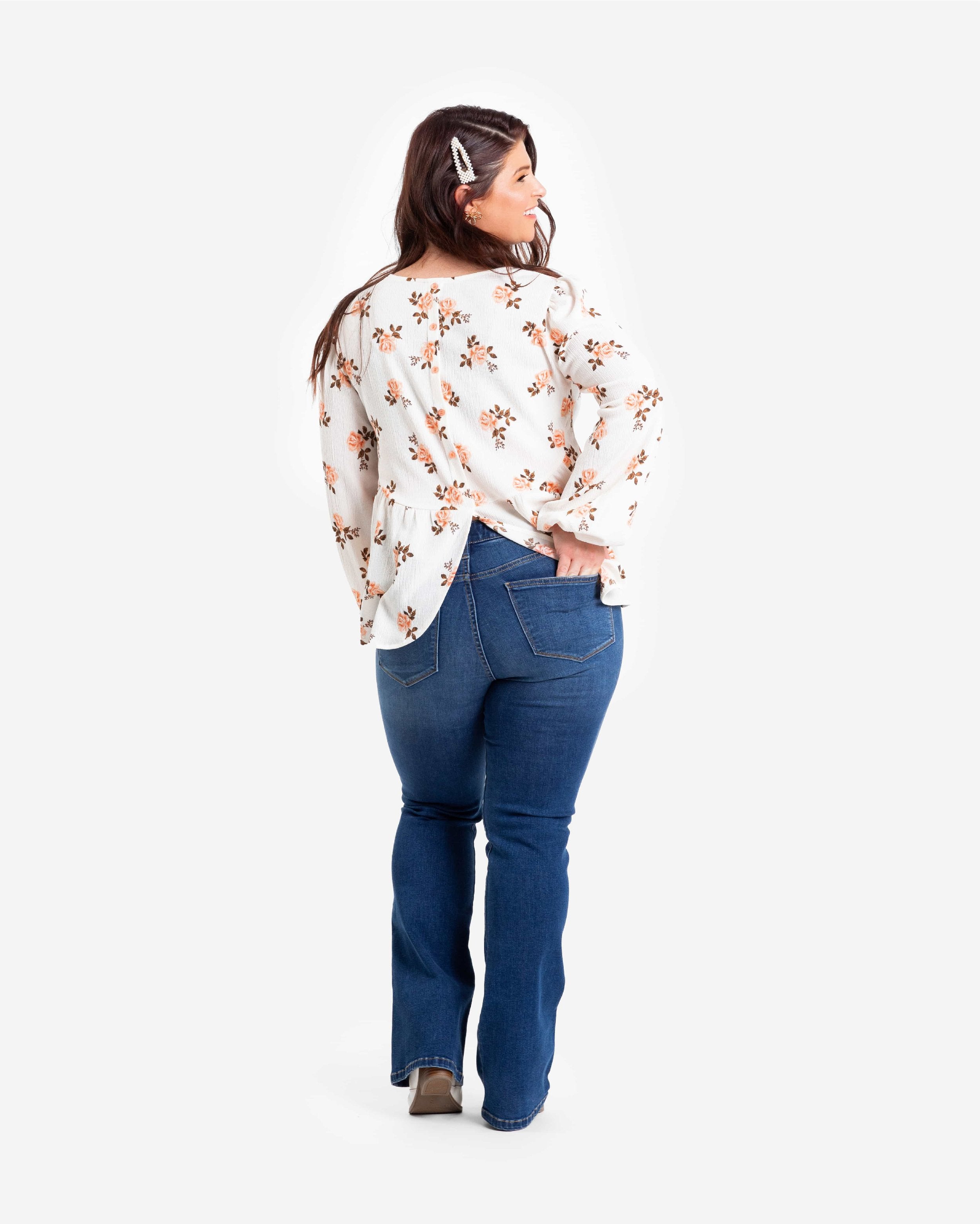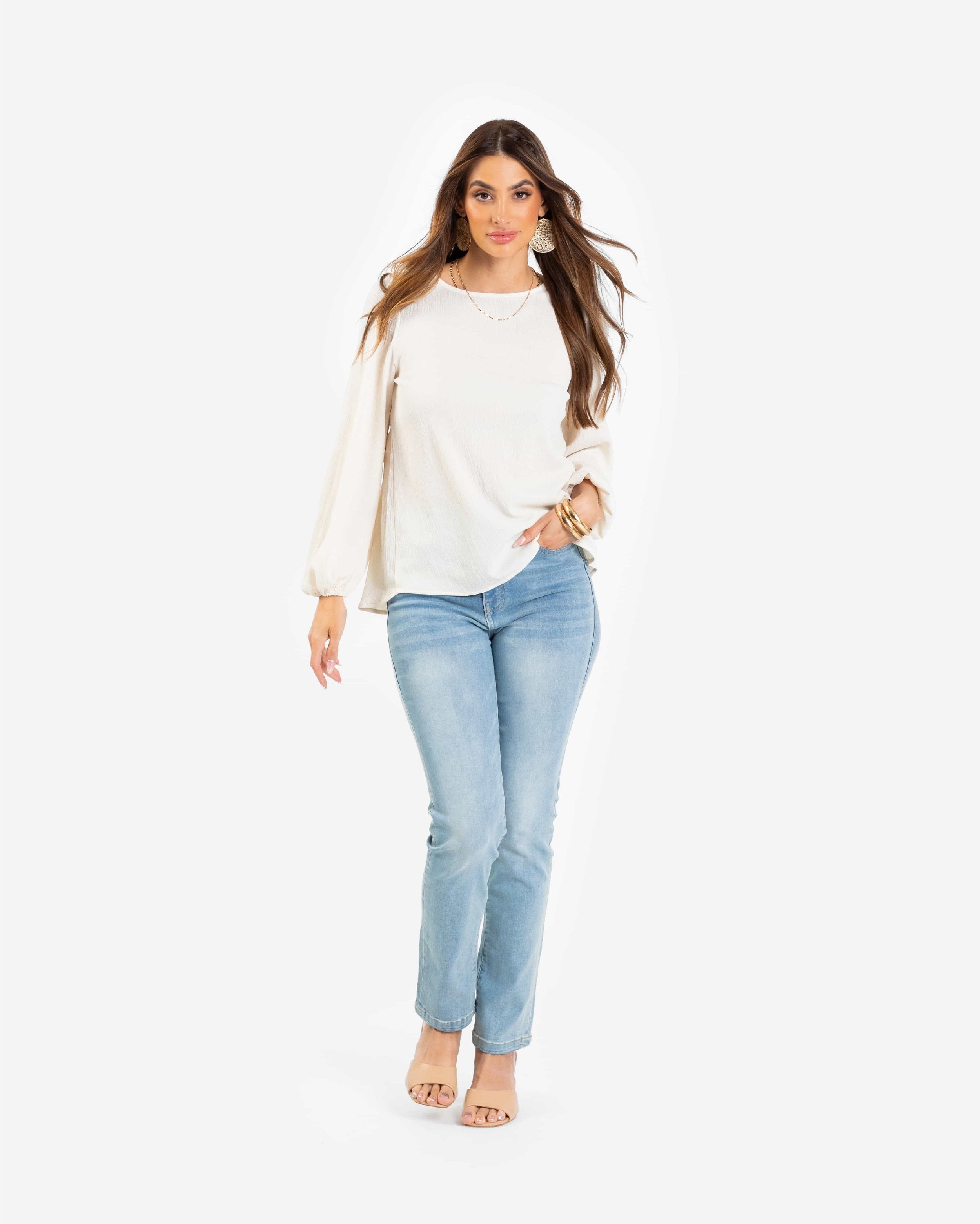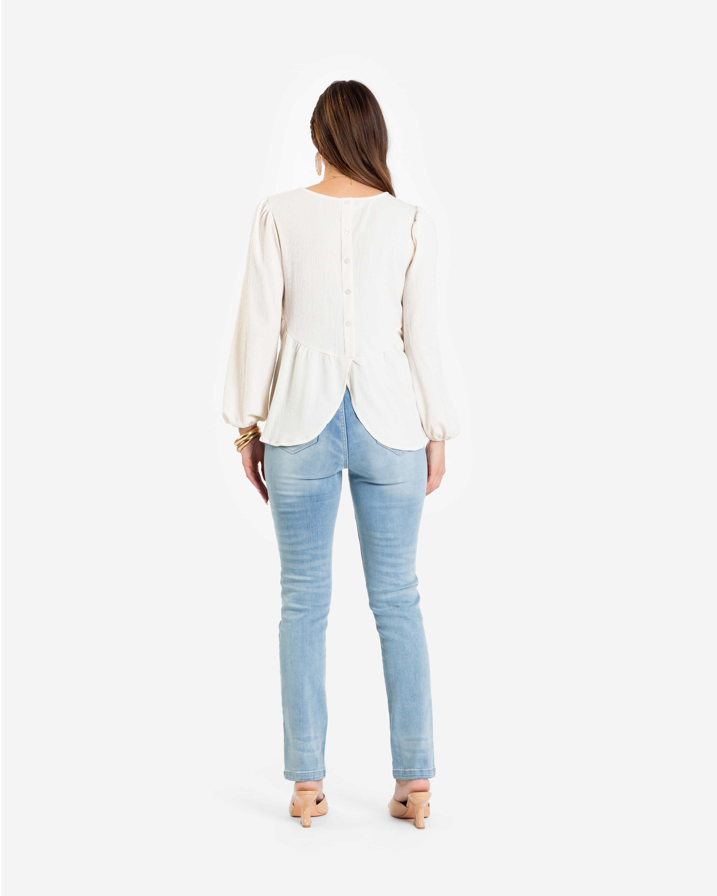 Simplicity meets versatility in the Vivian Button Back Long Sleeve Blouse. With clean lines and a modern boat neckline that defines effortless style, while the shirring throughout adds subtle detail to this timeless top.
