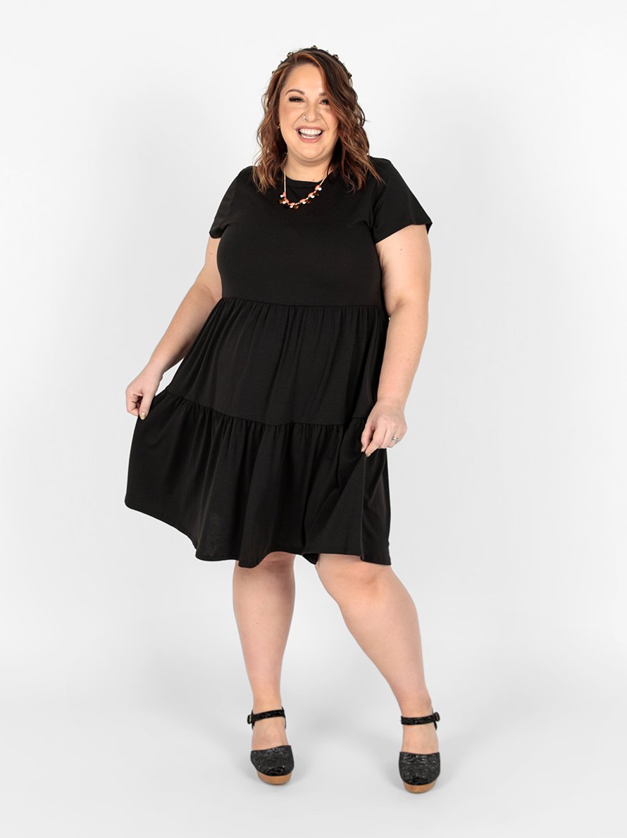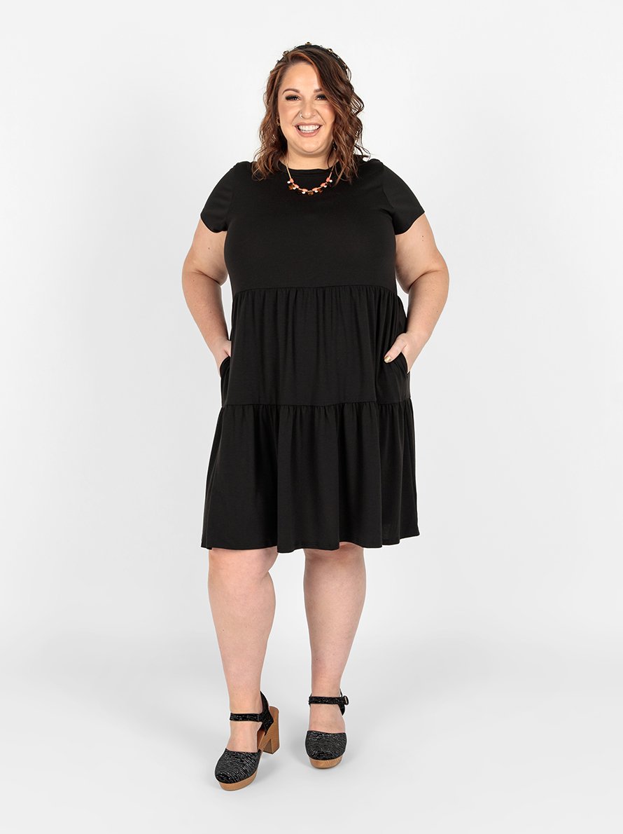 The Details: The Ariel is a three-tiered style dress with a rounded neckline, short sleeves, side seam pockets, and knee length. She comes in MVS 95/5 Poly/Span 190GSM and ITY Moss Crepe 95/5 Poly/Span 200GSM fabric. Ariel has a relaxed fit.