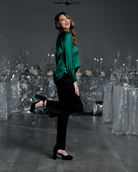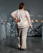 The Celeste Satin Blouse - a treasure within the LUXE Collection. Details include a mandarin collar v-neckline and comfortable raglan sleeves. She comes with full-length sleeves adorned with a cuff and single button closure. Admire the button front opening and the subtle shirring throughout the neckline. This blouse exudes an air of luxury and grace that is sure to turn heads.