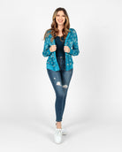 The Details: The Cheryl cardigan comes in a lightweight Hacci with a self cuff, bottom waistband, and a center front button placket through the neckband. She has no back detail and has dye to match the buttons. Fabric: Lightweight Hacci 95/5 Poly/Span 150GSM