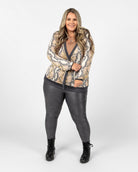 She also comes in a lightweight sweater knit with rib knit detail on the cuffs and bottom waistband. Here she has a custom v-shape cut-out design at the top back, dye to match buttons, and hits at the hip length.