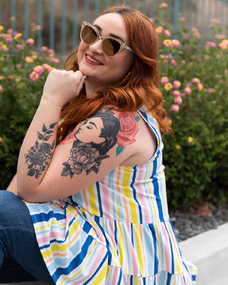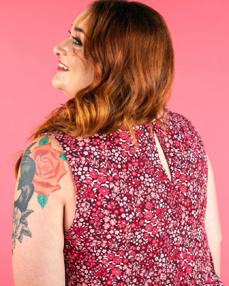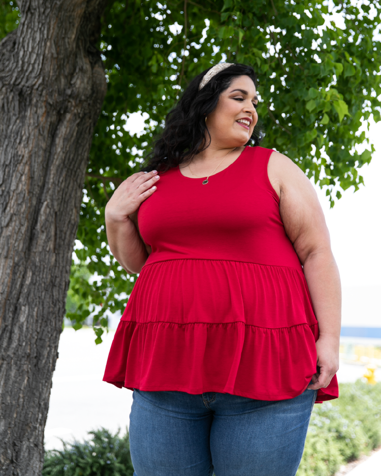 The Eliana is a sleeveless and tiered swing tank top with a rounded neckline, cutout detail at the back seam, and a relaxed fit. She comes in MVS 95/5 Poly/Span fabric.