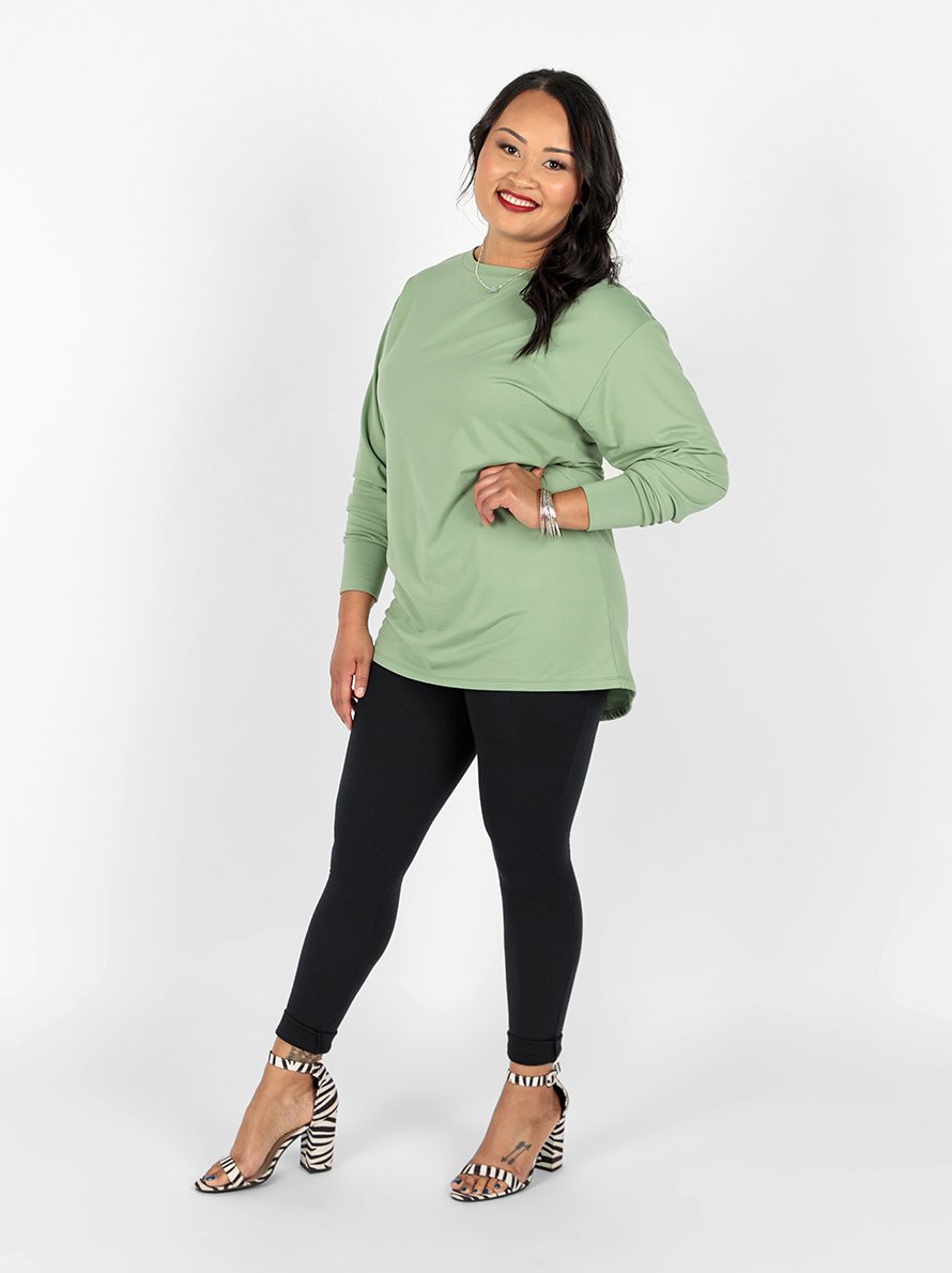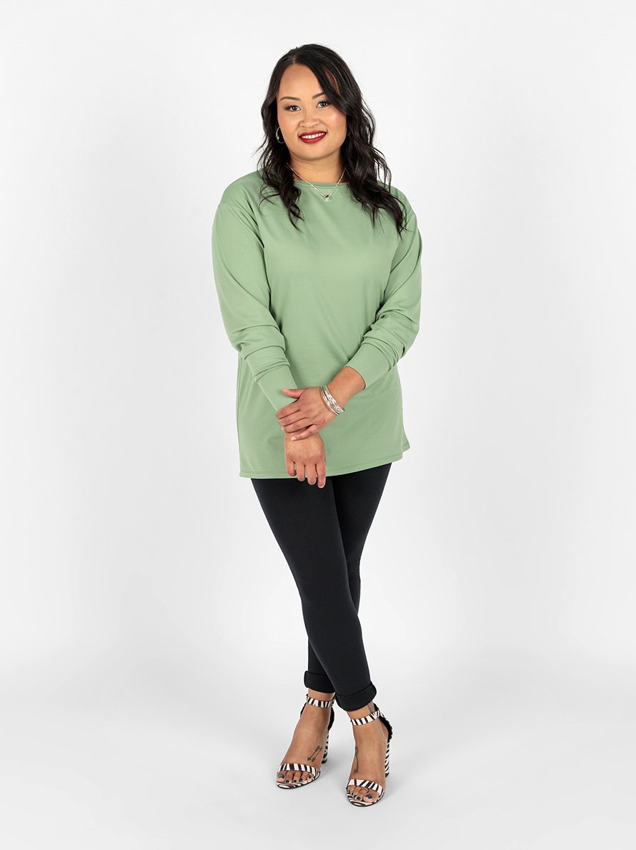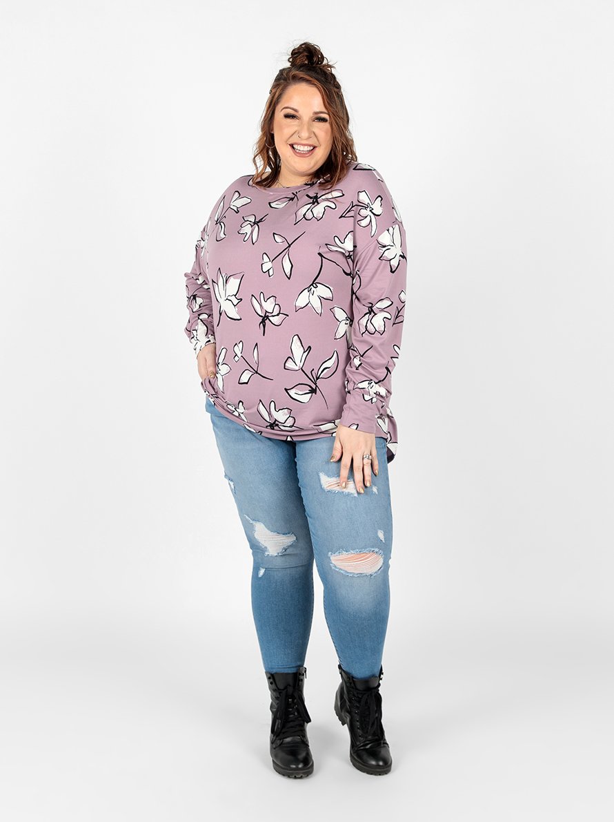 The Nora is a boat neck top with drop shoulders, relaxed long sleeves with a cuff, a high-low hemline, a boat neckline, and a tunic length. She comes in a relaxed fit.