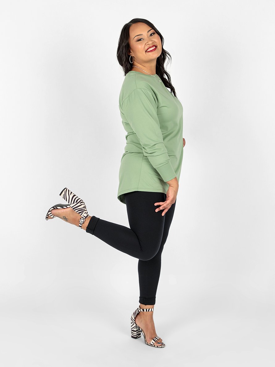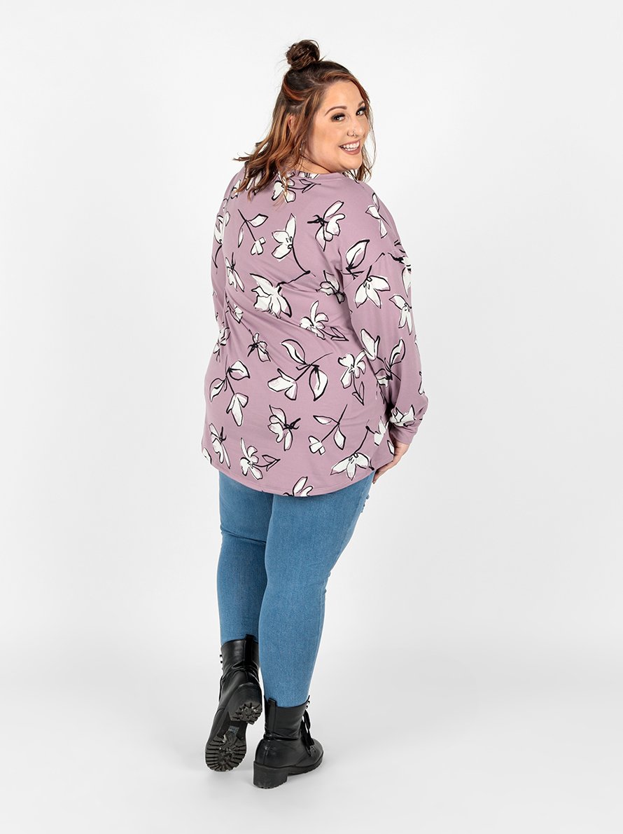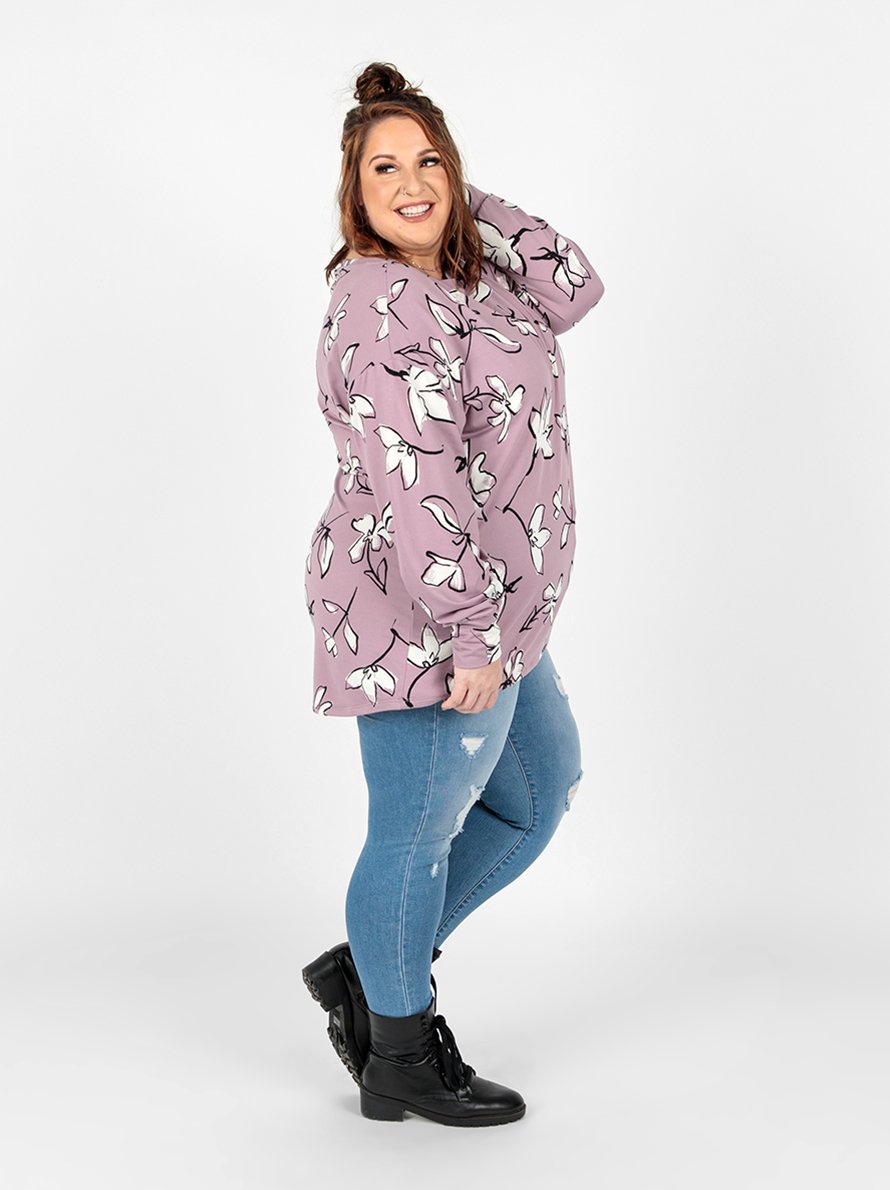 The Nora is a boat neck top with drop shoulders, relaxed long sleeves with a cuff, a high-low hemline, a boat neckline, and a tunic length. She comes in a relaxed fit.