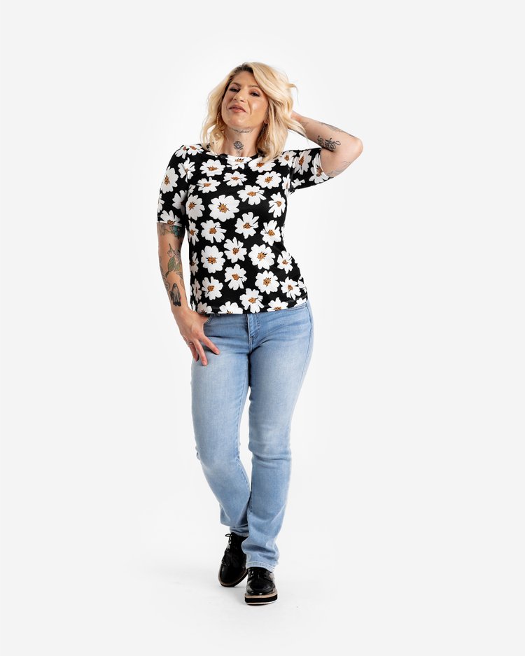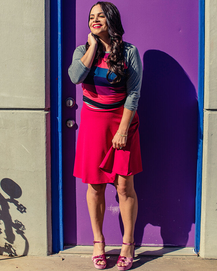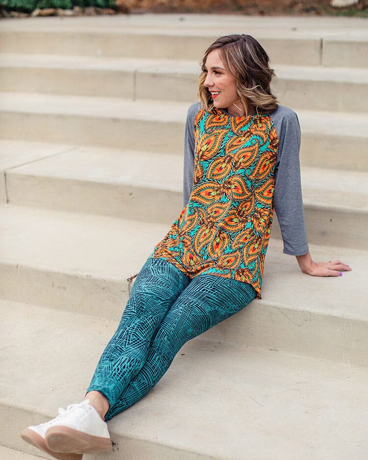 The Details: The Randy is a unisex knit tee with raglan, mid-length sleeves — in a contrasting, patterned fabric.