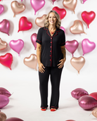 The top features a chic collar, button-down front, luxe piping, and a relaxed, dreamy fit. The bottoms balance comfort and style with an elastic waist and drawcord, slash pockets, coordinating piping, and a relaxed full-length leg.