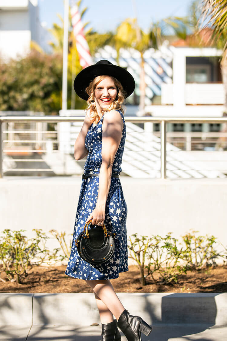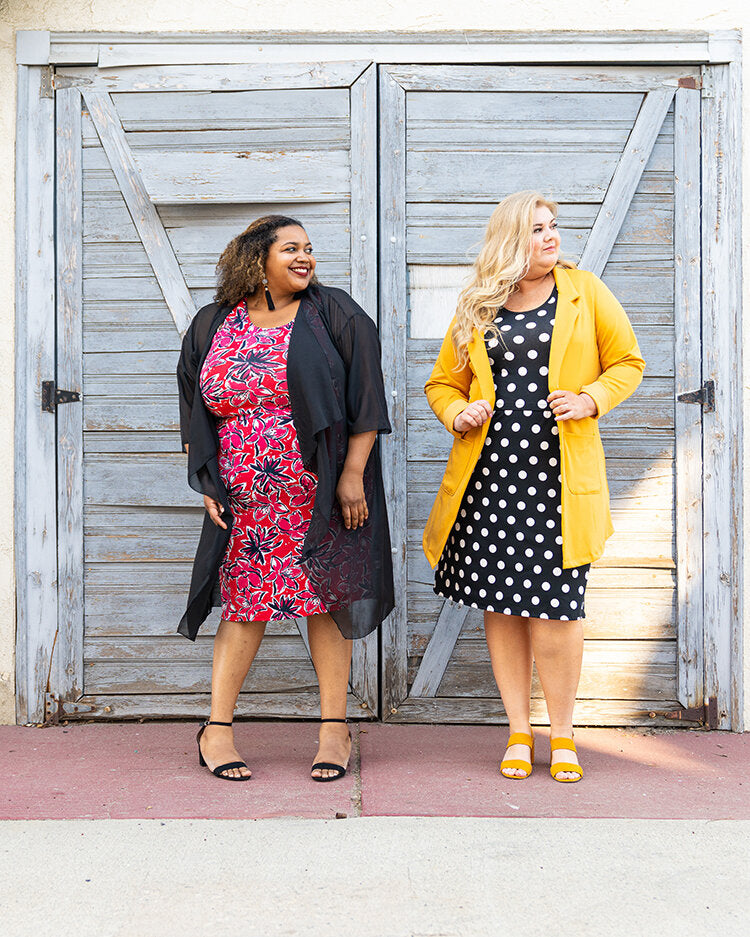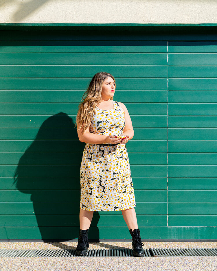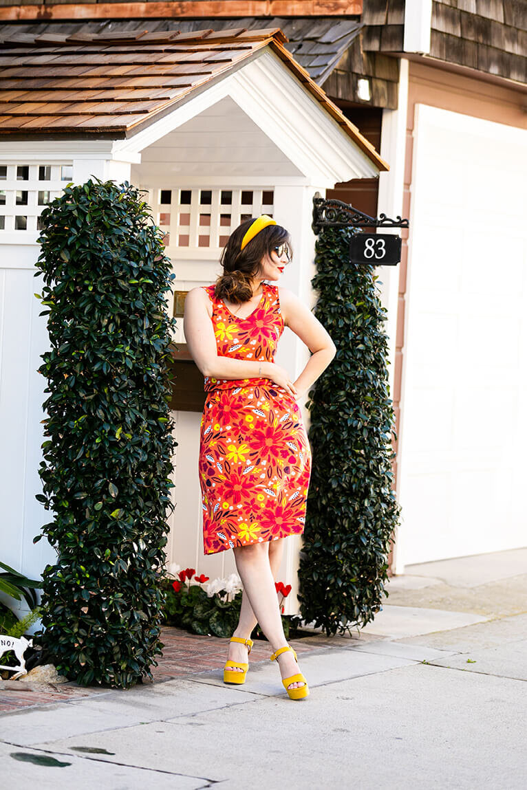 The Details: The Summer is a sleeveless, scoop-neck dress — with encased elastic at the waist. She’s knee length and comes in MVS fabric.
