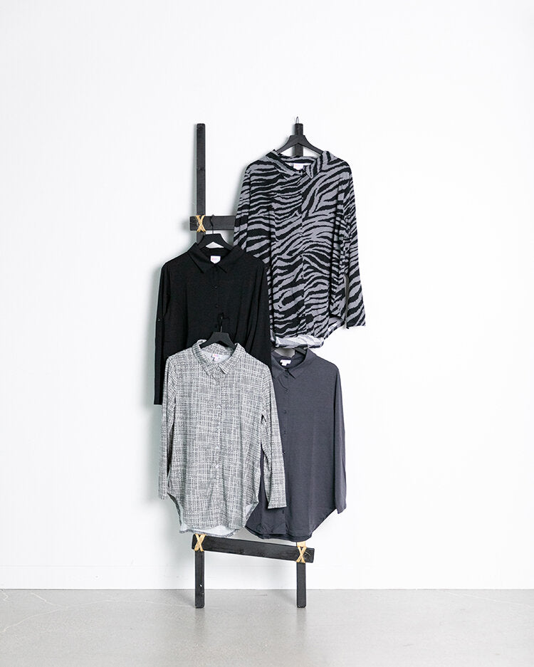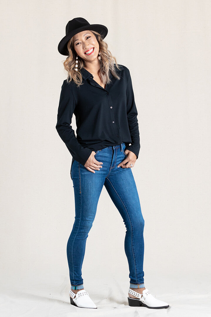 The Valentina is an adjustable sleeve button-up, with roll-tab sleeves and a side seam scallop. It has a collar and a lovely back yoke. The Valentina also has a true to size fit.