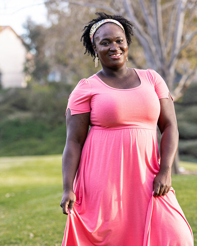 The Details: The Riley is a slit-sleeved dress with an elastic waist seam and a shirred skirt. This dress has shirring at the shoulder and comes in MVS and DTY fabric.